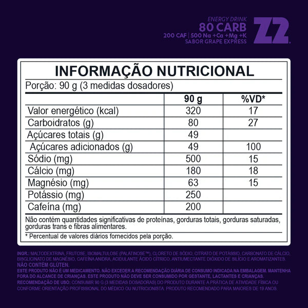 Cada dose de Z2 Power Powder contém 84g do blend exclusivo Z2 de carboidratos: maltodextrina, frutose e palatinose, na proporção 1:0,8:0,2, desenvolvido para otimizar a absorção de altas quantidades de carboidrato, minimizando desconfortos gastrointestinais e maximizando sua performance.